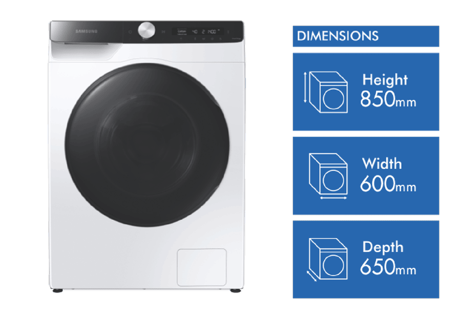 Your laundry routines will get a boost with the Samsung 8.5kg-6kg Combo Washer Dryer. This white front load washing machine has a generous 8.5kg washing capacity and 1400rpm spin speed to tackle large loads efficiently. The 20 versatile wash programs include options like Intense Cold, Hygiene Steam, Delicates, and Air Wash to suit any fabric. Samsung’s innovative BubbleWash system powerfully dissolves detergent for a deeper clean, while BubbleSoak soaks clothes prior to the main wash. The StayClean drawer prevents buildup and odors. With a 4.5 star WELS water rating and 4 star energy rating, this washer is water and energy efficient. At the end of the wash, use the handy 6kg drying capacity with drying programs tailored for all fabrics. Measuring 600mm W x 850mm H x 650mm D, this Samsung combo washer dryer will streamline laundry in any home. With innovative features and a 2 year warranty, experience next-level fabric care. The manufacturer’s part number for this product is WD85T504DBE. Check out this Samsung Combo Washer Dryer today for easy, efficient laundry.