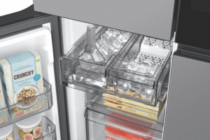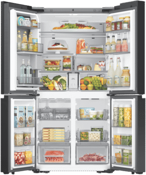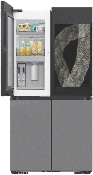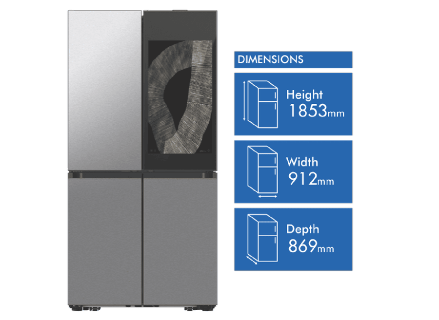 This Samsung Bespoke 809L French door refrigerator brings smart technology to your kitchen with its Family Hub feature. The massive 809L capacity splits into a generous 482L fridge and 327L freezer, giving your family plenty of space for groceries. AI Vision Inside lets you see what’s in your fridge without opening the door, while the Auto Open Door feature provides hands-free access when your arms are full. Enjoy ice and filtered water from the dispenser, plus the convenience of the Beverage Centre with Auto Fill Jug. The Cool Select+ Flex Zone gives you adjustable temperature settings for different foods, and the Slide-In-Shelf accommodates tall items with ease. With a 3.5 Star energy rating and finished in sleek stainless steel, this dual-hinged fridge combines style with functionality. Share family moments on the Family Board and enjoy peace of mind with a 2 year manufacturer’s warranty. Model number: SRF9900BFH.