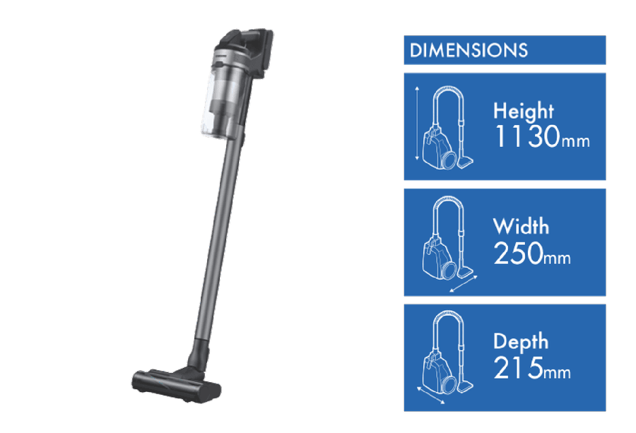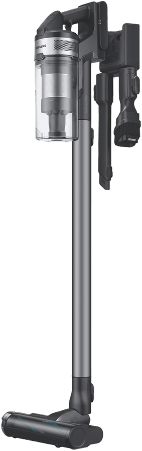 Searching for an exceptional stick vacuum to tackle dirt and dust with ease? The Samsung Jet 75E Complete Cordless Vacuum in sleek silver is your solution. This innovative cordless vacuum delivers powerful 200 watt suction to lift embedded dirt from carpets and hard floors. Its 21.6V lithium ion battery provides up to 60 minutes of fade-free power for quick, convenient cleaning. With a range of specialized tools, the Jet 75E handles any cleaning task. The soft action brush gently cleans delicate surfaces, while the turbo brush thoroughly removes pet hair. Easily reach high corners and ceilings with the combination tool. Weighing only 2.6kg, the vacuum is lightweight and maneuverable. The 0.8L dustbin is simple to empty. Backed by Samsung’s 2 year warranty, the Jet 75E combines advanced technology with everyday convenience. Experience next-level cleaning performance with this feature-packed stick vacuum. VS20B75ACR5 is the manufacturer’s part number for this product. Check out the Samsung Jet 75E Complete Cordless Vacuum today for impeccable cleanliness in your home. Disclaimers: (1)Based on internal testing, in accordance with the IEC 62885-4 CL.5.8 standard. Measured at the inlet of the non accessorized tool, using Jet Mode and a battery that is fully charged. Results may vary depending on actual usage. (2)The stated run time applies when using a high capacity battery (2000mA) and the minimum power level with a non motorized tool attached, Results may vary depending on the actual usage.