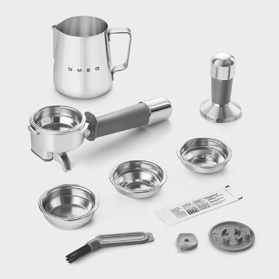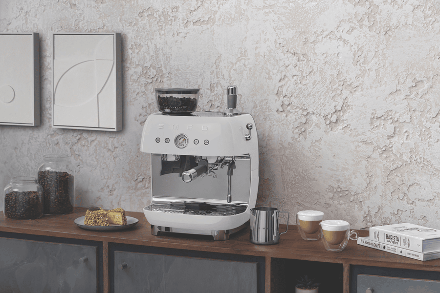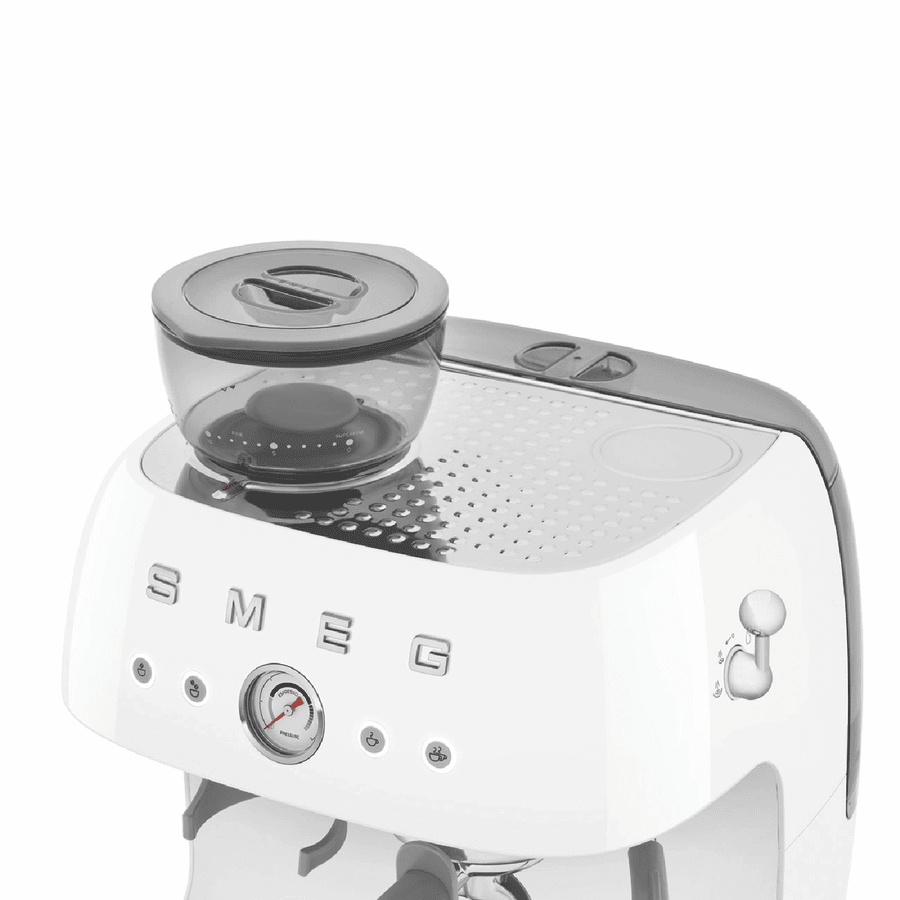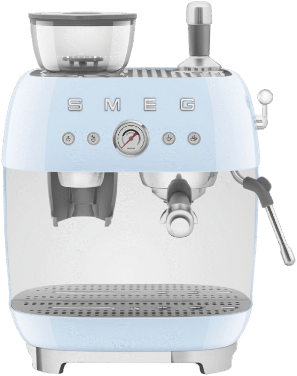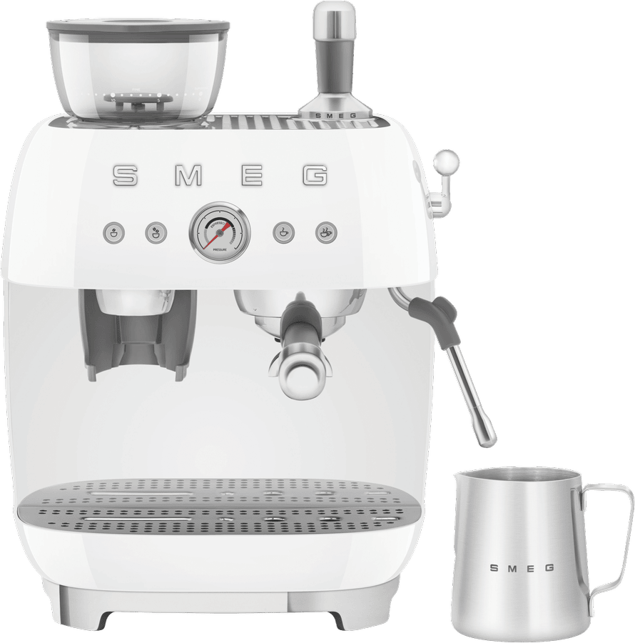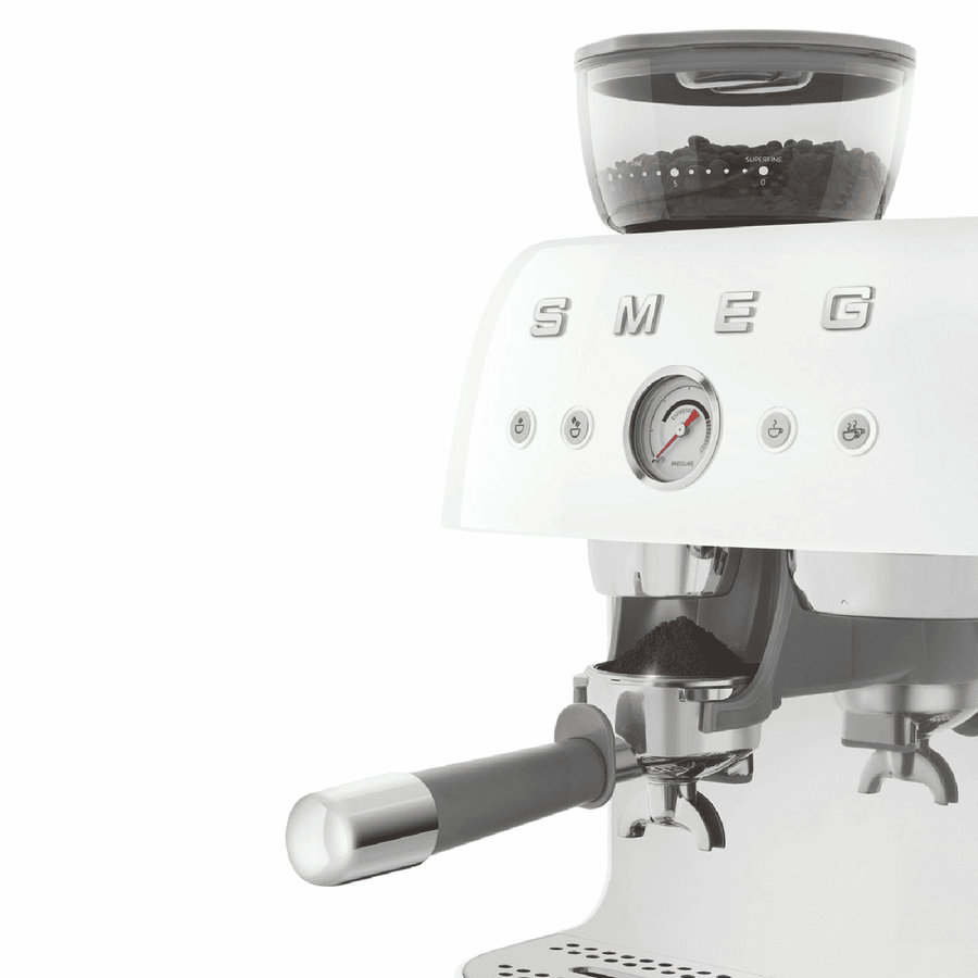 Bring cafe quality espresso to your kitchen with the Smeg 50’s Style Espresso Machine. This retro-inspired beauty pairs classic Italian design with modern convenience. With a powerful 1600W thermoblock heating system, it heats up fast while the 20 bar pump pressure extracts rich, aromatic espresso from finely ground beans. Adjust the grind using the built-in conical burr grinder, with 250g capacity. Craft your perfect shot with the manual 4-button control panel, adjusting coffee length and volume. With a generous 2.5L water tank, make coffee for the whole family. The stainless steel group head and dual thermoblocks ensure consistent temperatures, shot after shot. Stay on top of maintenance with the descale indicator and empty tank alarm. This espresso machine makes it easy to create barista-quality coffee experiences at home, all in a compact retro package. Backed by a 2 year Smeg warranty for peace of mind. Made in Italy.