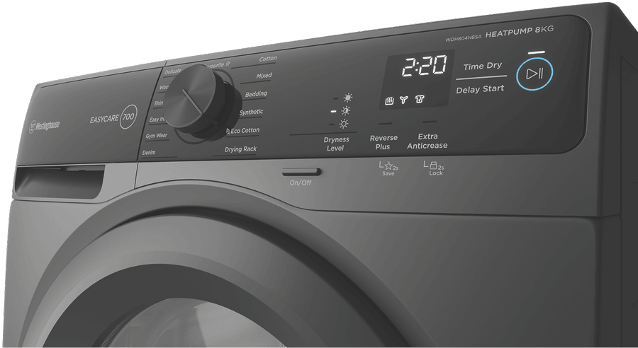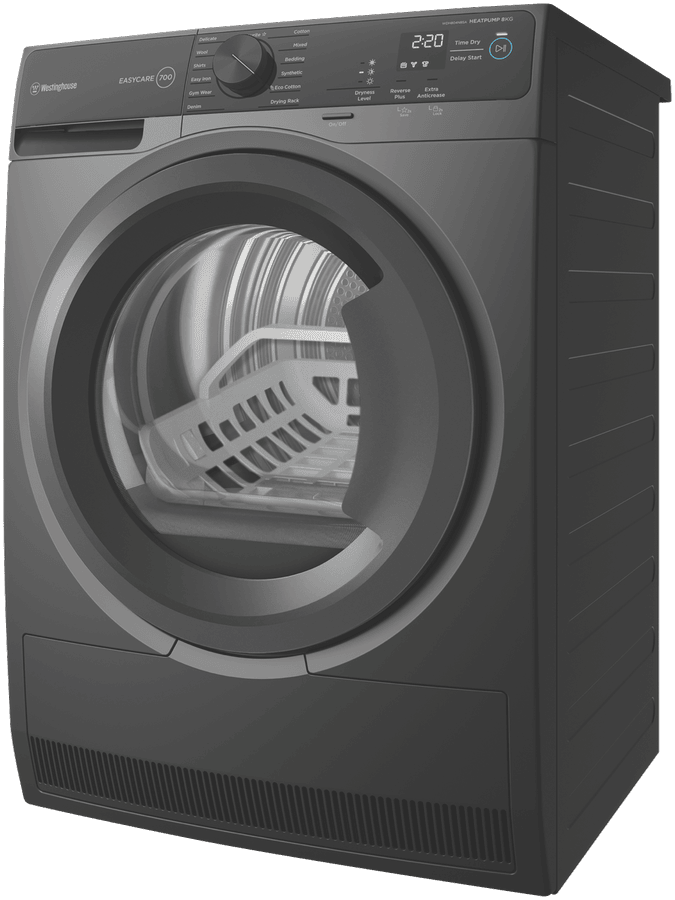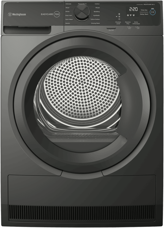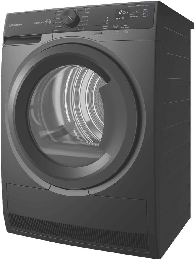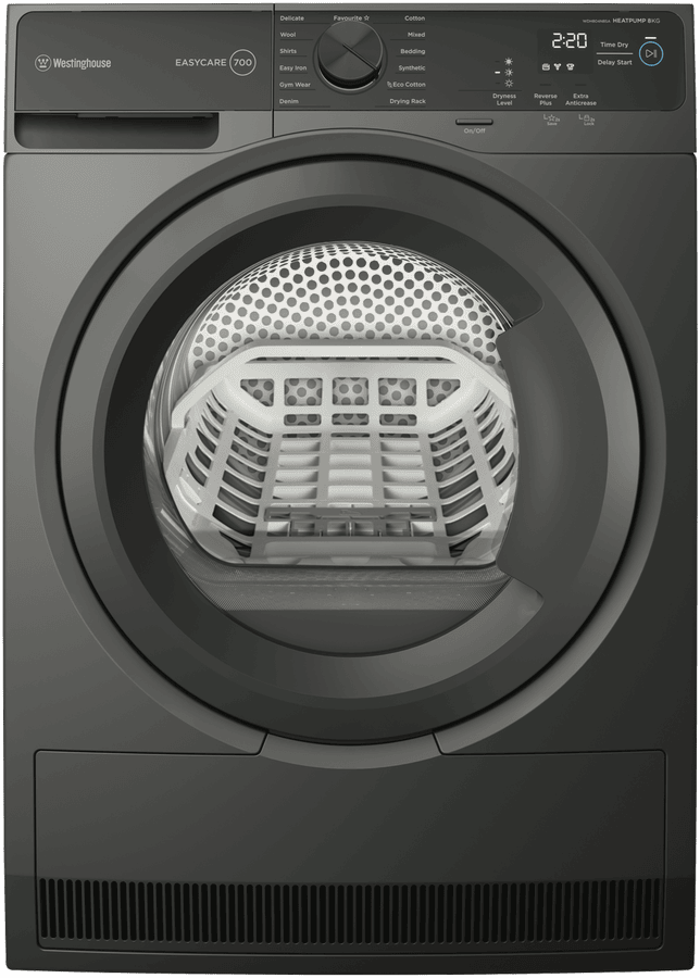 Eco-friendly home laundry gets easy with the Westinghouse 8kg Heat Pump Dryer. With a generous 8kg capacity, 15 tailored drying programs and a 7 star energy rating, this smart dryer is designed to gently care for all your fabrics while saving energy and water. Sensor Dry Technology precisely monitors moisture levels, automatically stopping when clothes are dry, preventing over-drying and saving electricity. The intuitive control panel makes operation a breeze with delay start, extra anti-crease and cupboard dry options. Metallic grey in a stylish finish, the dryer’s 850mm height and slimline 600mm width allow flexible installation. EasyCare 700 series features include child lock, cool down function, lint filter alert and drum light. Covered by a 2 year warranty, the WDH804N8SA delivers efficient, eco-friendly drying for busy households. With its clever technology and generous capacity, this Westinghouse model is the sensible choice for easy, energy-saving laundry days.